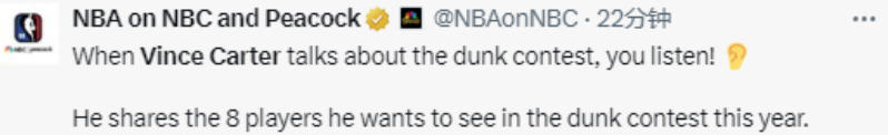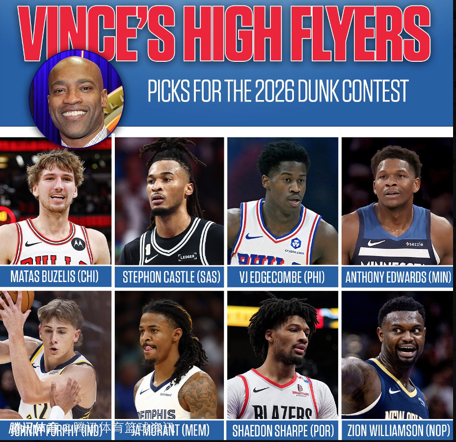 2025-11-12 10:20北京时间11月12日,前NBA球星文斯-卡特在参加NBC的节目时谈到了自己想在今年全明星扣篮大赛所看到的8位球员:爱德华兹、莫兰特、锡安、夏普、卡斯尔、布泽利斯、VJ-埃奇库姆和弗菲。