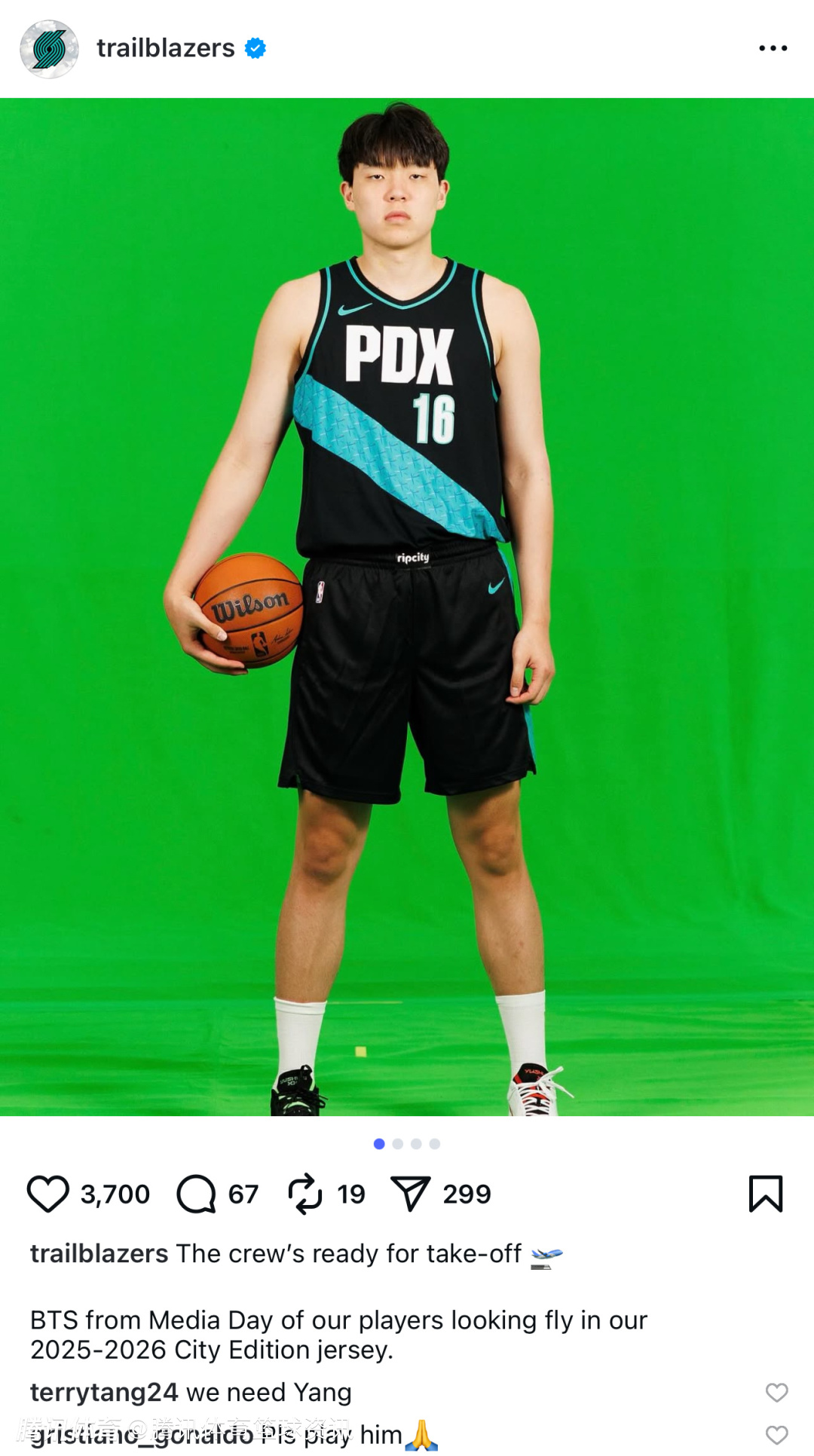 开拓者官方晒杨瀚森城市版球衣定妆照!球迷留言:请让他上场打球