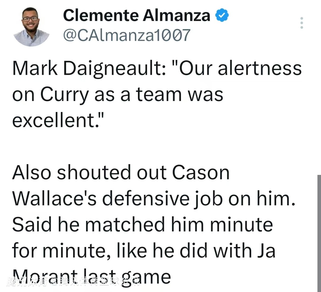 戴格诺特谈到雷霆队的防守时表示:“我们在防守纪律性上做得非常好。勇士是一支需要我们高度专注于比赛计划、充分理解对方球员特点的球队。全队对库里的警惕性都很高。尤其是卡森-华莱士,他对库里的防守堪称完美。前几天晚上他刚防守过莫兰特,今晚又全程对位库里,表现无可挑剔。”