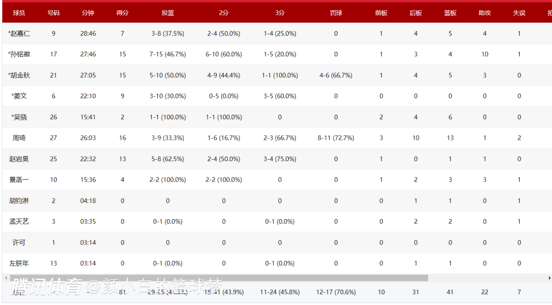 周琦只打了26分钟,孙铭徽只打了28分钟,赵嘉仁只打了28分钟,胡金秋仅打27分钟,赵岩昊仅打22分钟,周琦被换下场时他没有一点喜悦的神色,因为这是周琦职业生涯参与全运会首次没有夺冠,此前三次代表辽宁队他都是金牌。