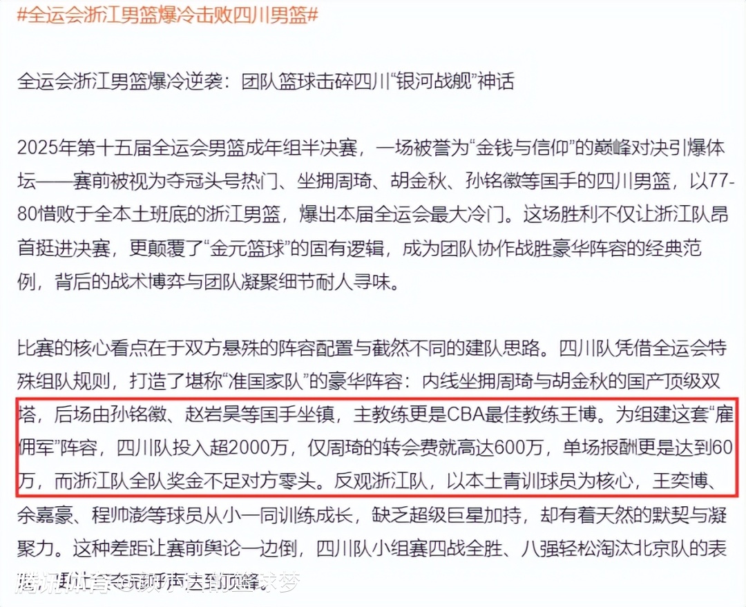 本次四川队的阵容是浙江广厦的班底,也被誉为是本届全运会最强‘雇佣兵’军团,孙铭徽、胡金秋、赵嘉仁、赵岩昊、吴骁、周琦等,主帅更是CBA最佳教头王博,四川为组建这套阵容投入超过2000万,周琦的转会费就高达600万。(这些金额都是网传没有确切的消息,但四川的确是耗费巨资)