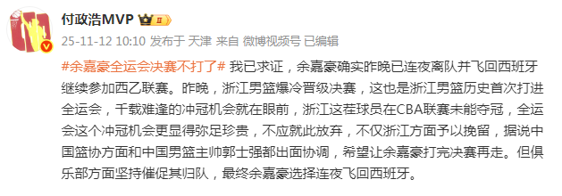 2025-11-12 18:30媒体人付政浩表示,他已求证过,浙江男篮中锋余嘉豪确实在11日晚连夜离开全运会飞回了西班牙继续参加西乙联赛。尽管浙江队、中国篮协和中国男篮主教练都曾出面协调与挽留,但余嘉豪效力的欧洲俱乐部依然坚持催促他归队。