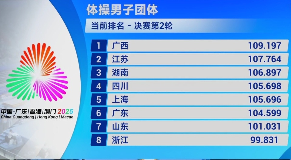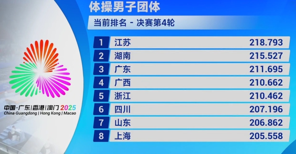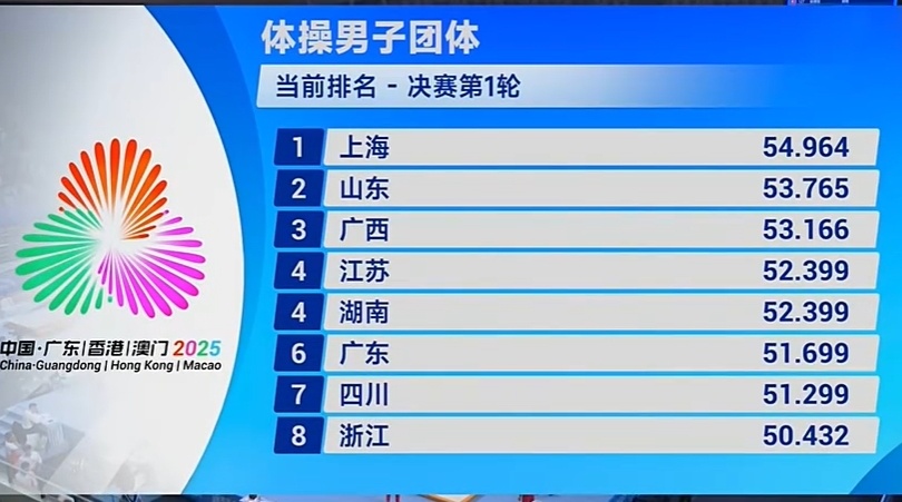 资格赛里,张博恒领衔的湖南队以329.593排在第一,尤浩率领的江苏队以322.626位列第二,广东队以317.059位列第三...之后是浙江/316.825、广西/314.326、四川/313.060、上海/308.827、山东/308.428
