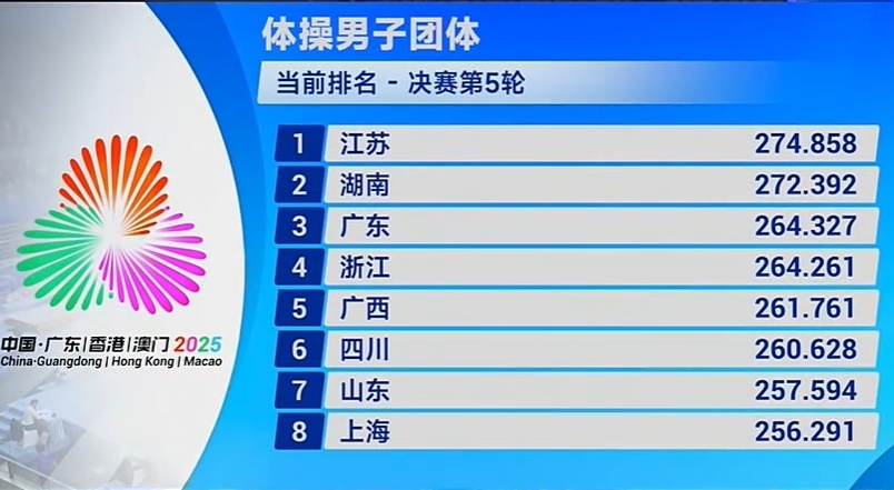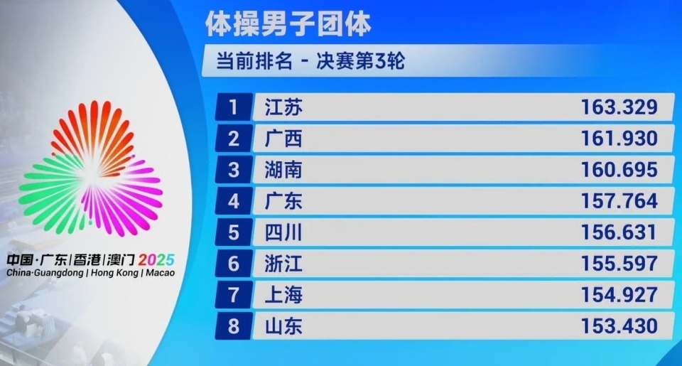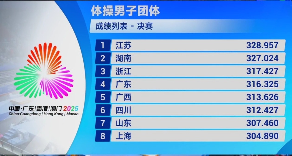 2025-11-12 22:30第十五届全国运动会竞技体操男子团体决赛在肇庆新区体育中心落下帷幕:尤浩、侍聪、孙炜、洪延明、唐淇、杨焱智组成的江苏队不负众望,以328.957实现卫冕!