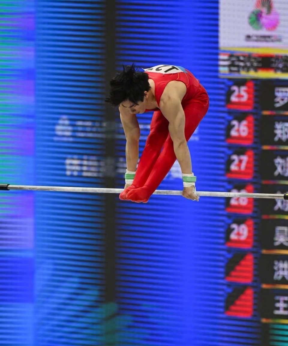 洪延明杠上没有什么难度,但得分非常理想;杨家兴完成非常稳健。