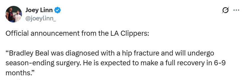 赛季报销的手术意味着比尔更有可能执行与快船队合同中2026-27赛季的球员选项,该选项价值562万美元。