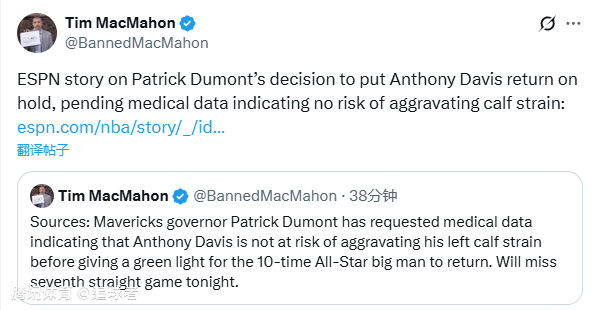 据ESPN名记Tim MacMahon报道,独行侠队老板杜蒙特已要求提供医疗数据,以确认安东尼-戴维斯左小腿拉伤不会加重,才会批准这位十届全明星中锋复出,浓眉今天将连续第七场缺席比赛。