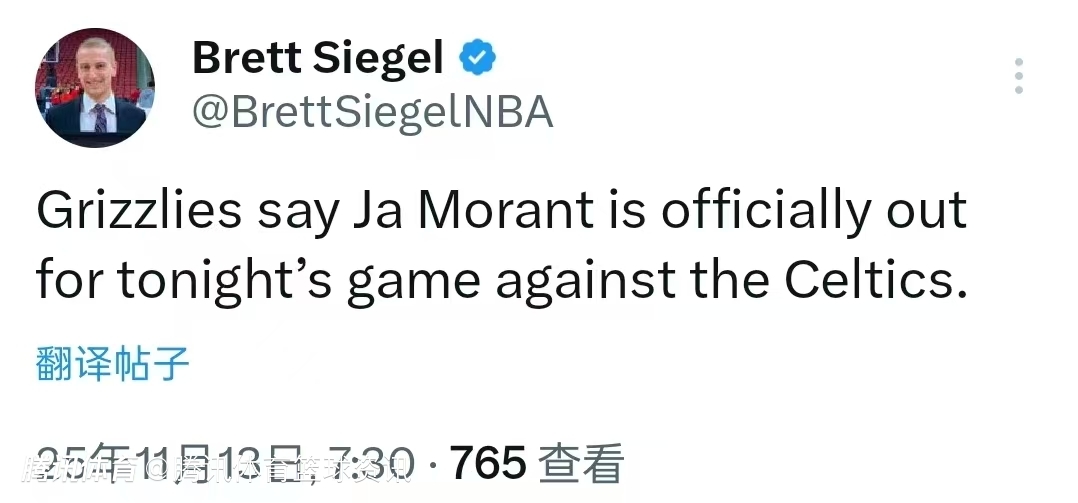 2025-11-13 08:10北京时间11月13日,NBA常规赛继续进行,灰熊对阵凯尔特人。赛前灰熊官方宣布,球队后卫莫兰特因脚踝酸痛将不会出战本场比赛。