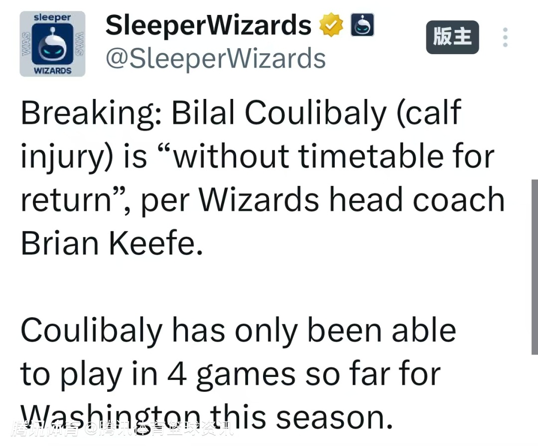奇才公布库利巴利伤情:小腿受伤无回归时间表 本赛季仅出战4场比赛