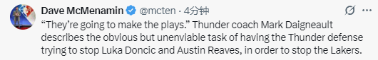 2025-11-13 09:30北京时间11月13日,NBA常规赛继续进行,湖人队对阵雷霆队。赛前,雷霆队主教练戴格诺特接受媒体采访,谈到了东契奇和里夫斯。