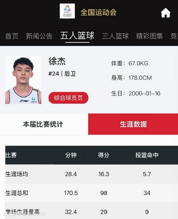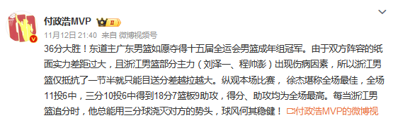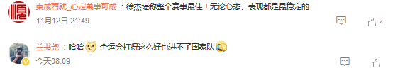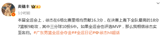媒体人麦穗丰发文点评:“徐杰在6场比赛里场均贡献16.3分,在决赛上轰下全队最高的18分7篮板9助攻,其中三分球10投6中。如果全运会也评选MVP,那么我相信徐杰实至名归。”