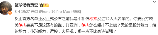 结合到高诗岩接近30岁的年龄段,他想要在2028年的奥运会舞台踏上最终12人名单的难度非常之大,而徐杰今年只有25岁,几乎是完全错开了一个巅峰时期,或许这才是球迷感到惊讶最重要因素,对于郭士强挑选阵容名单提出质疑。