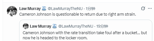 掘金官方:卡梅隆-约翰逊右臂拉伤 对阵快船回归存疑