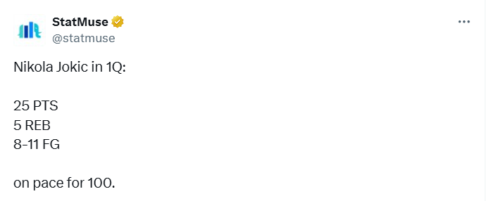 创NBA中锋首节得分纪录!约基奇狂轰25分引热议 美媒调侃要拿100分