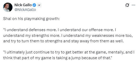 在谈到自己组织能力的进化时,亚历山大说道:“随着比赛经验的积累、赛季的推进以及职业生涯的延续,比赛在我眼里已经完全变慢了。我更懂得阅读防守,也更懂我们该如何进攻了。我更清楚自己的优势,同时也更明白自己的短板,我会努力把短板转化为优势,也会尽量避免暴露短板。说到底,我一直在努力提升自己,尤其是在心智层面。我认为,正是因为这份专注,我在组织进攻这方面的表现才有了飞跃。”
