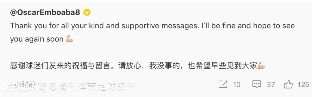 今天,奥斯卡通过社交媒体表示:“感谢球迷们发来的祝福与留言。请大家放心,我没事的,也希望能尽快见到你们。”