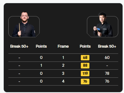 艾伦整场比赛中仅打进一颗红球,全场只得1分,而赵心童则打出单杆60分、78分和76分。