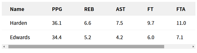 哈登在那个赛季场均出场36.8分钟,而爱德华兹本赛季至今场均仅出场28.4分钟,不过他常规出场时间通常在35-36分钟左右。基于这一情况,我们可以将哈登2018-19赛季的场均数据,与爱德华兹本赛季七场比赛的每36分钟数据进行对比。