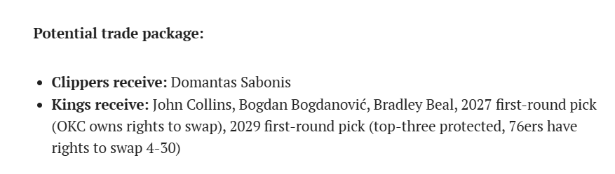 国王队得到:约翰-科林斯、博格丹-博格达诺维奇、比尔、2027年首轮签