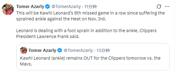 这已是莱昂纳德连续缺席的第6场比赛。此前快船总裁弗兰克曾透露,除了此前已知的脚踝扭伤,莱昂纳德的脚部也存在伤病情况,这也导致其归期持续延后。