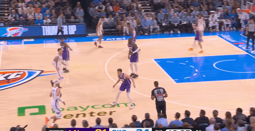 斯马特对位阿杰伊-米切尔,克内克特对位卡鲁索,艾顿对位哈尔滕施泰因。斯马特在退防时已经打手势指挥克内克特和艾顿注意防挡拆,当卡鲁索启动往中路突破,斯马特也尽力做了中路协防。然而,雷霆一个简单的挡拆打穿湖人防线,哈尔滕施泰因暴扣。