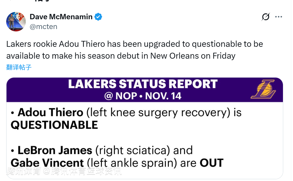 2025-11-14 07:50北京时间11月14日,湖人官方公布了球队最新伤情报告,新秀蒂耶罗状态升级为出战成疑,有望在周六对阵鹈鹕队的比赛中完成本赛季首秀。