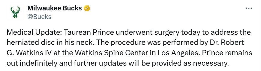雄鹿官方:普林斯已接受颈部椎间盘突出手术 将无限期缺阵