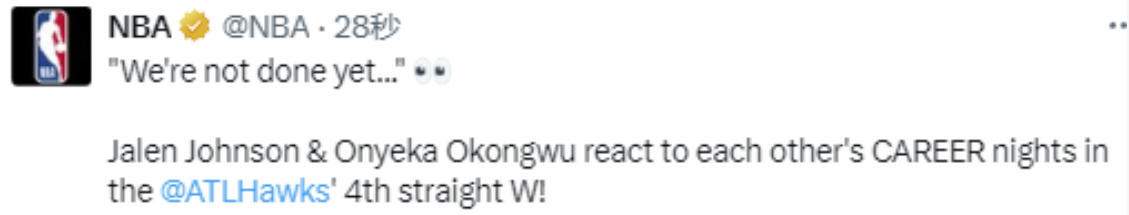 2025-11-14 14:10北京时间11月14日,NBA常规赛继续进行,老鹰队132-122击败爵士队。赛后,迎来生涯之夜的杰伦-约翰逊与奥孔古一起在场边接受媒体采访,两人也进行了一番商业互吹。