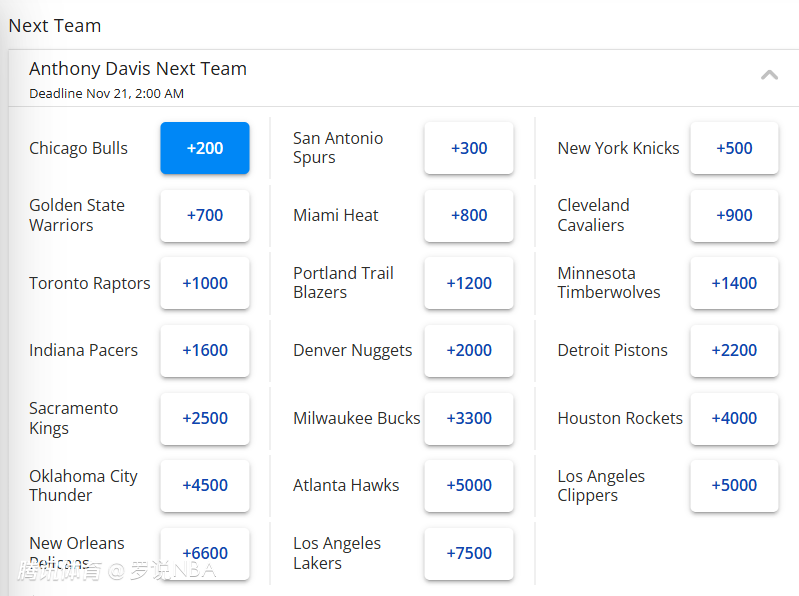 浓眉最新下家赔率出炉:公牛领跑马刺第2 勇士第4湖人第20