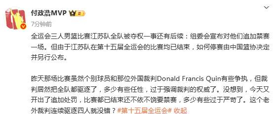 全运会性质的比赛并不是FIBA体系,此时需要追加吹罚的通告则是让争议进一步升级,这一支江苏全运男篮结束了全运会比赛任务后,下一届是否还打存在很大的不确定因素,此时组委会的追加吹罚,是否真正能执行到位?