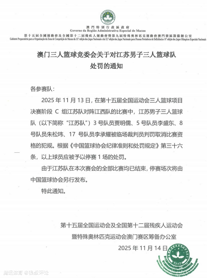 根据最新的媒体报道,组委会宣布对他们追加禁赛一场。但由于江苏队在第十五届全运会的比赛均已结束,如何停赛由中国篮协决定并另行公布。