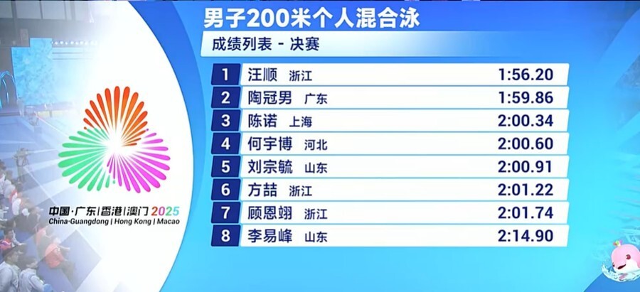 全运会男子200米混合泳:老将汪顺实现四连冠,夺全运会第18金