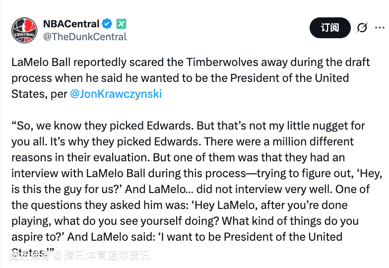 2025-11-15 00:10北京时间11月15日,据美记Jon Krawczynski报道,在2020年选秀大会过程中,三球曾表示“想当美国总统”,这一表态把森林狼给“吓退”了。
