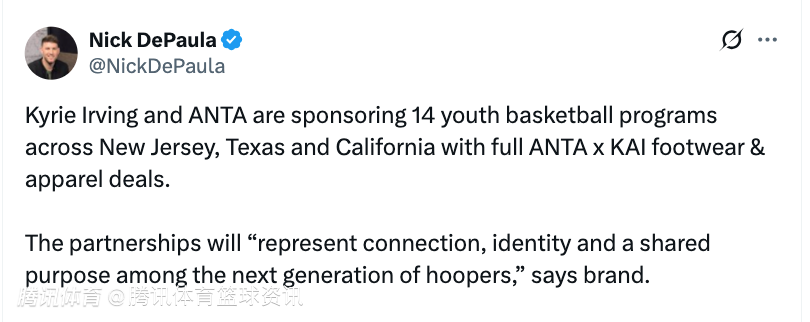 2025-11-15 00:30北京时间11月15日,据美记尼克-德保拉报道,欧文与安踏合作,为新泽西、得克萨斯和加利福尼亚的14个青少年篮球项目提供赞助,包含全套安踏×KAI系列的球鞋与服饰。