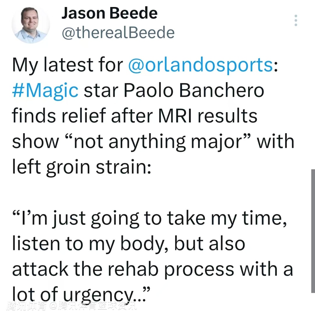 尽管他已确定缺席今天对阵篮网的NBA杯赛,回归赛场的时间也将取决于治疗反应(球队会每日对他进行评估),但检查结果还是让班凯罗松了口气。