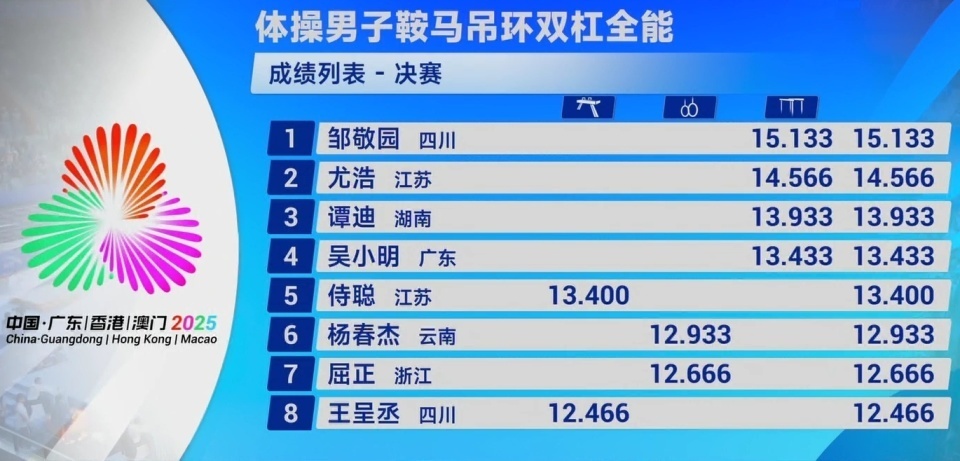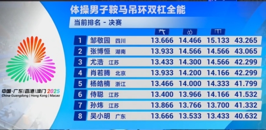 2025-11-15 07:20随着第十五届全运会竞技体操男子全能角逐尘埃落定,作为衍生项目鞍马吊环双杠/半全能结果也随之揭晓:四川名将邹敬园以43.265分,成为全运会该项目首金得主!