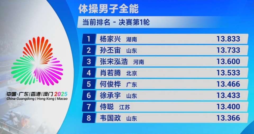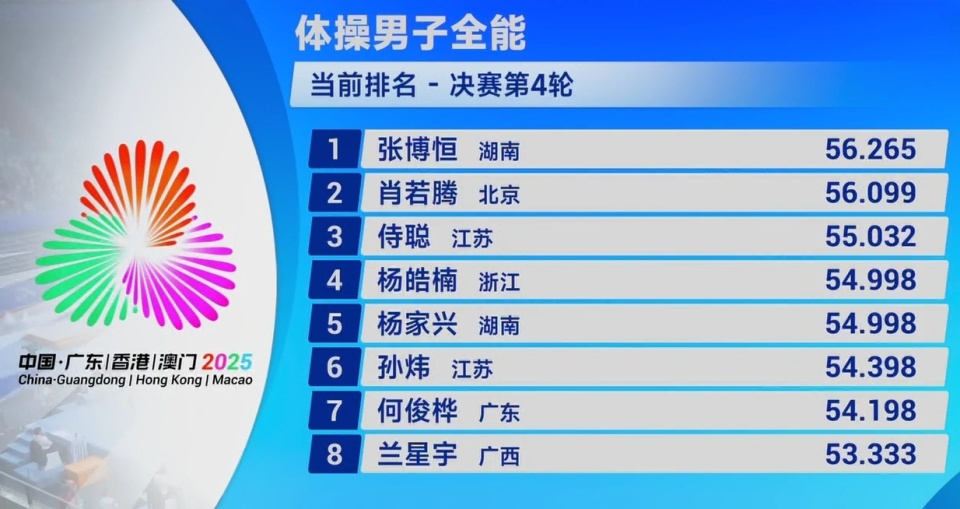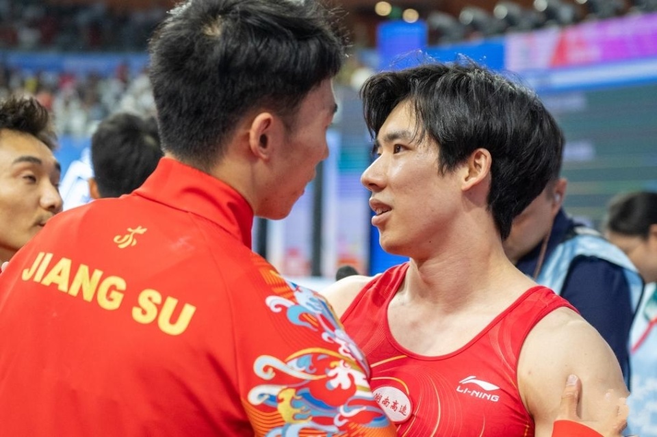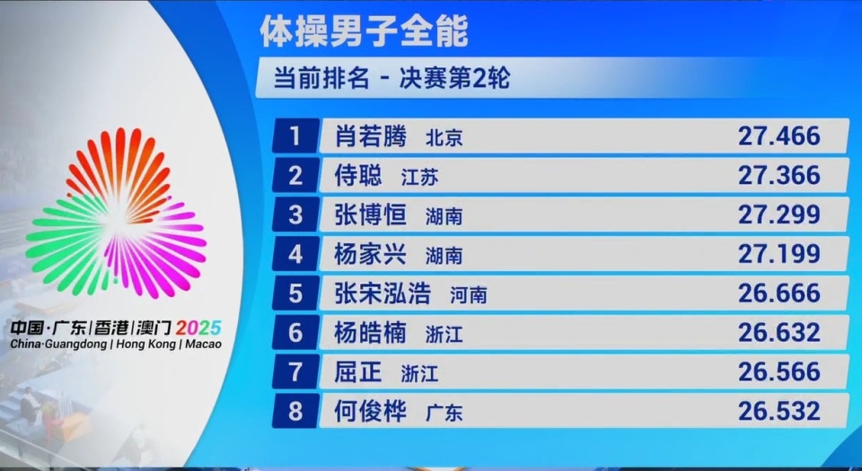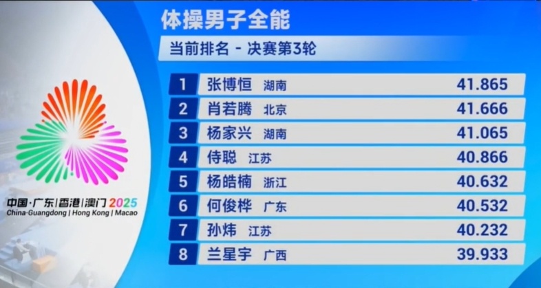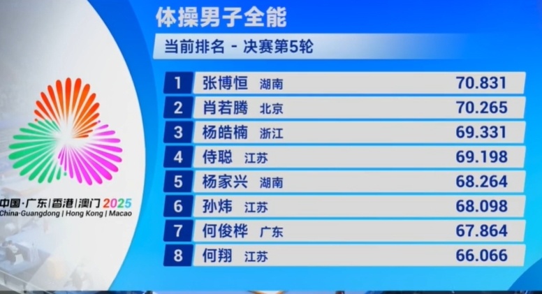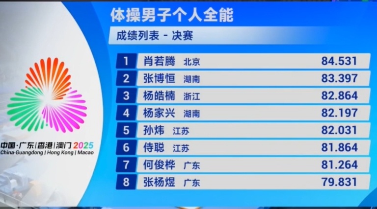 2025-11-15 07:20第十五届全国运动会体操项目在肇庆新区体育中心结束男子全能决赛的比拼:北京老将肖若腾以84.531卫冕!