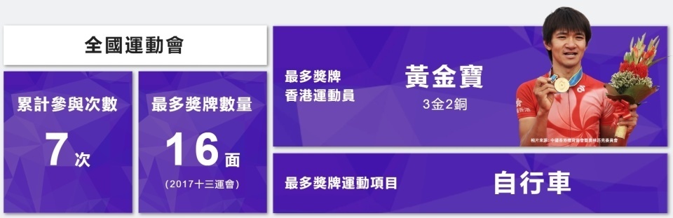 97年首届只有黄金宝公路自行车个人赛1金、01年2金2银1铜,05年1金3铜、09年2金1银4铜、13年1金3银3铜牌、17年十三运的2金7银7铜共16枚创下纪录、21年2金5铜。