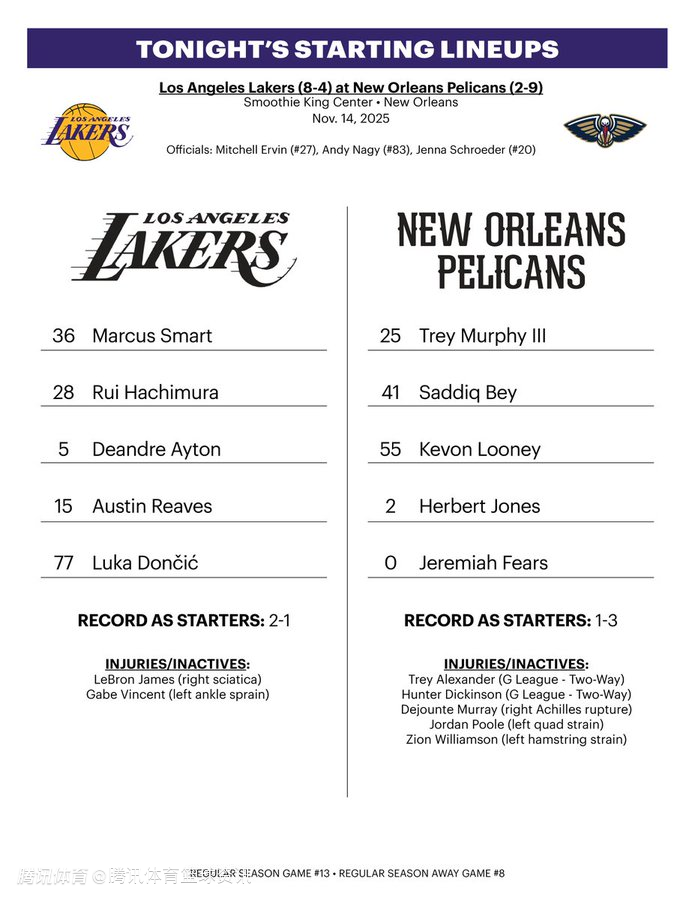 2025-11-15 09:00北京时间11月15日,NBA杯比赛继续进行,湖人队对阵鹈鹕队。赛前,湖人队公布了本场比赛的首发阵容。