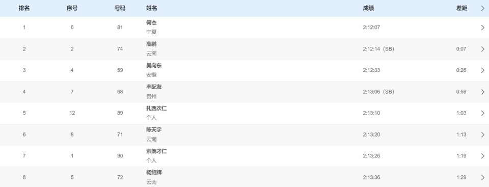 宁夏队的何杰以2小时12分07秒的成绩成功摘金,云南队的高鹏2小时12分14秒创赛季最佳获得银牌,安徽队选手吴向东2小时12分33秒获得了铜牌。