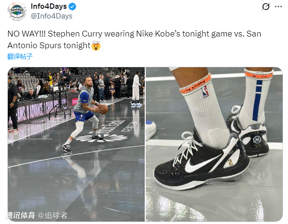 库里上脚科比6引热议,美球迷的一些言论——“哇喔,他要拿70分了”、“从未想到会有这一天”、“他终于有哨了,库里的耐克哨要来了”。