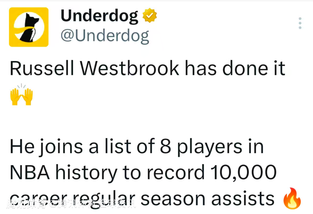 根据数据统计显示,威斯布鲁克职业生涯助攻数已达到10000次,成为NBA历史上第八位达到这一里程碑的球员,其他七位分别是斯托克顿、保罗、基德、詹姆斯、纳什、马克-杰克逊和魔术师约翰逊。