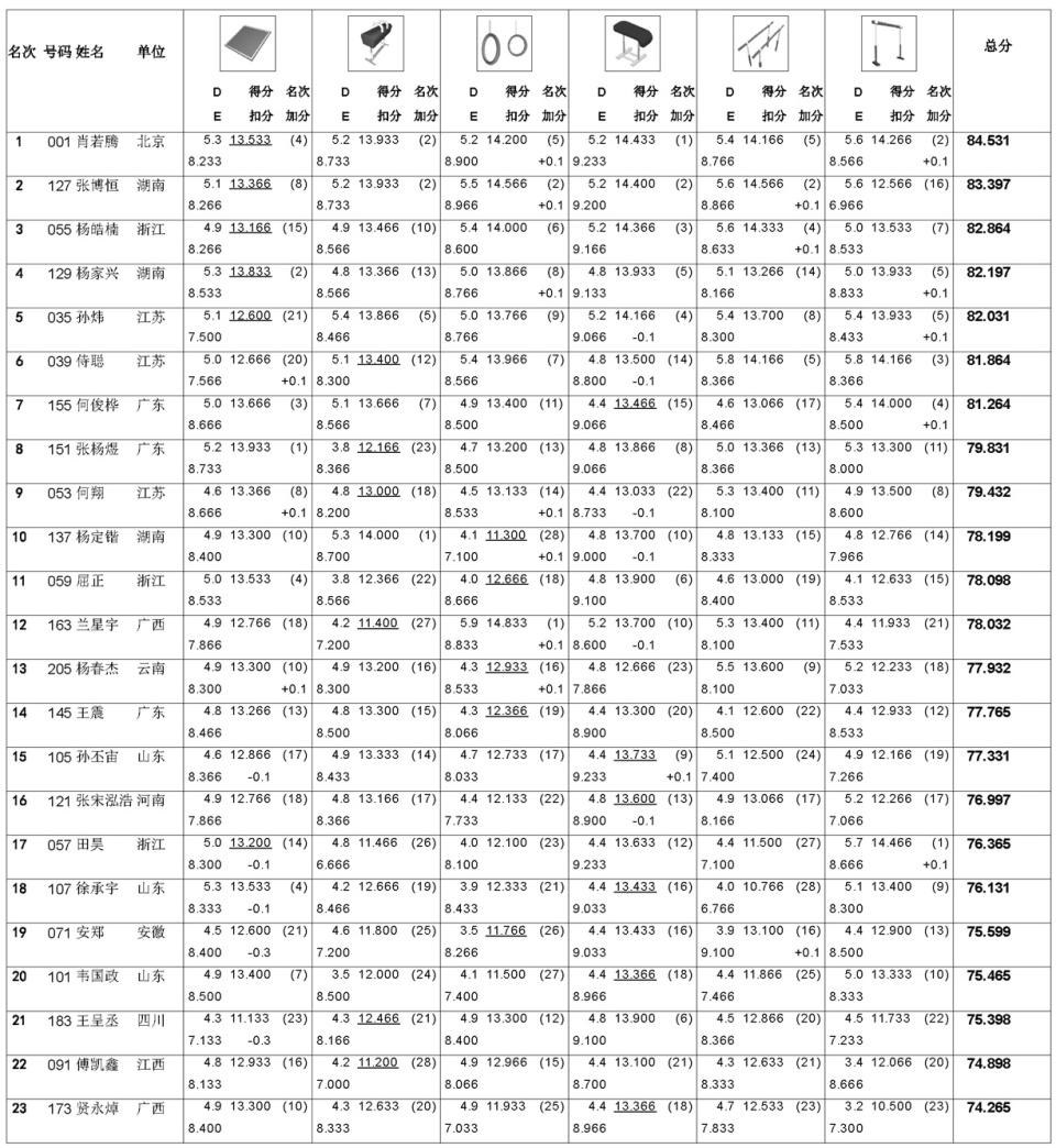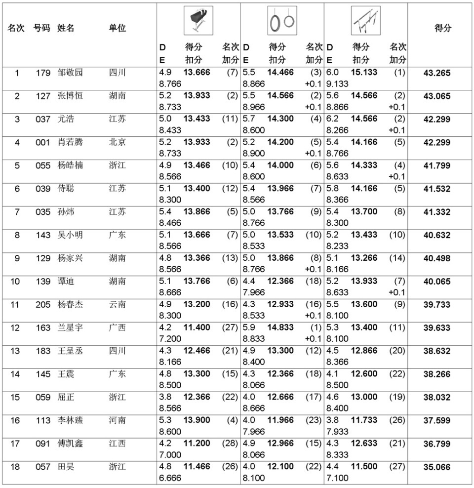 铜牌得主杨皓楠的自由操15和鞍马10偏弱,其余四项都还不错;排在第四名湖南选手杨家兴,则是鞍马和双杠跌出前十;