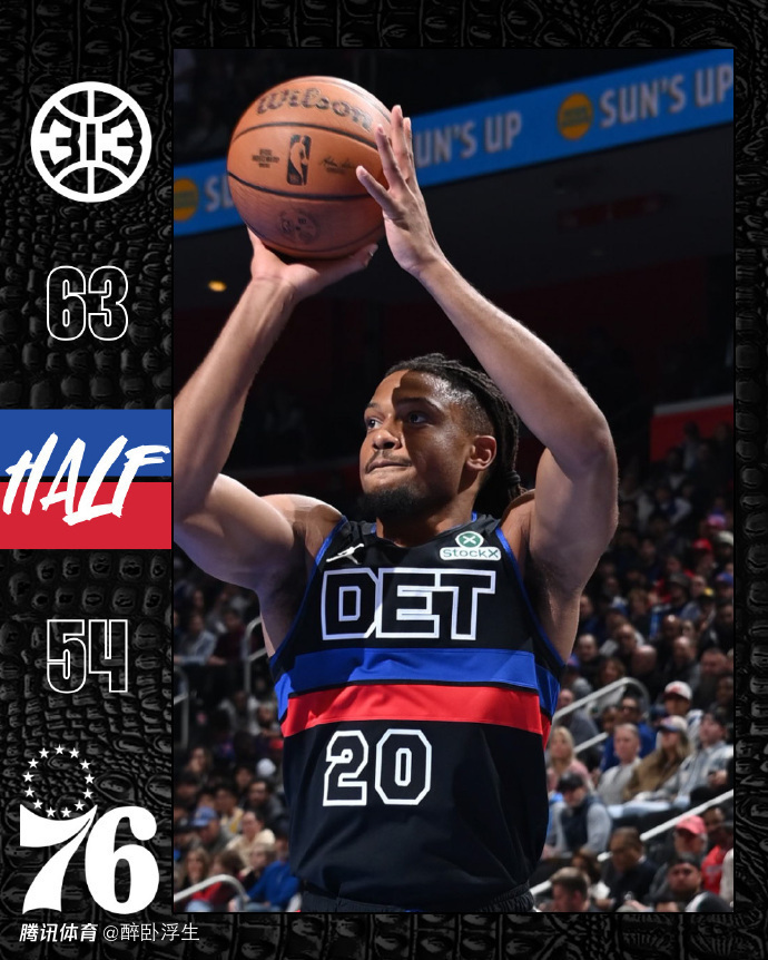 次节比赛,76人率先一波11-3攻势反超7分,前5分钟活塞40-45落后。格林连续三分开火得分,引领活塞打出一波11-1攻势反超5分,活塞随后持续压制76人逐步扩大领先优势,活塞单节35-27净胜8分,上半场结束活塞63-54领先76人9分。前两节比赛双方均是两人得分上双,活塞三分22中11,邓罗3记三分13分与格林3记三分15分,76人三分20中7,马克西13中4得到12分与埃奇库姆3记三分13分。