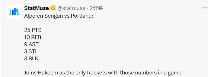 表现同样出色的还有申京,此役他出战36分钟,13投9中得到25分10篮板9助攻3抢断3盖帽,在场正负值+21。根据数据统计显示,在火箭队史上,除了申京之外,只有奥拉朱旺能在单场比赛中打出上述数据。