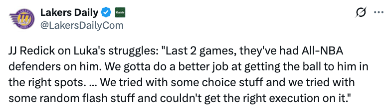 谈到东契奇的困境,雷迪克表示:“过去两场比赛,对手都派了最佳阵容级别的防守者盯防他。我们得更好地把球传到他的舒适进攻点上。之前试了些精心设计的战术,也用了些随机的无球掩护,但执行效果都不好。”此役东契奇投篮16中6,拿到24分7篮板12助攻。