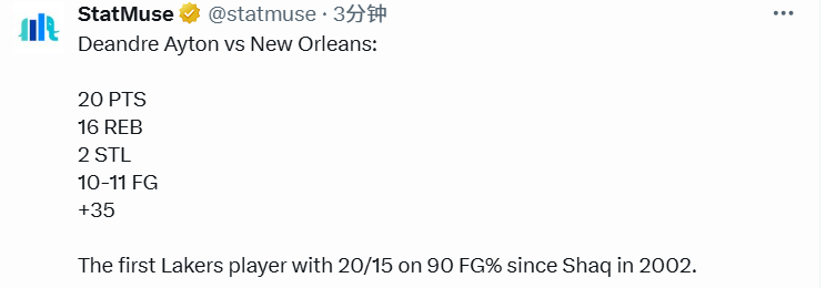 艾顿90%+命中率砍至少20分15篮板 自02年奥尼尔后湖人队史首人