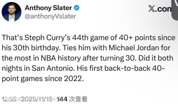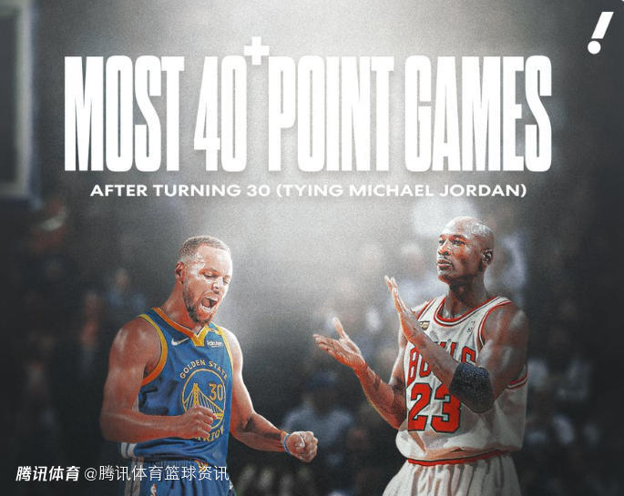 值得一提的是,库里在上一场比赛中(对手也是马刺队)刚砍下了30岁后的第43次40+,当时有记者还对库里表示,相信你肯定可以在生涯结束前追平乔丹,库里还笑称“借你吉言”。