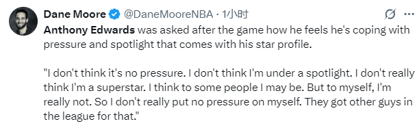 在被问及如何应对球星身份带来的压力与关注时,爱德华兹表示:“我不觉得有什么压力,也不认为自己处于聚光灯下。我其实并不觉得自己是超级巨星。可能在有些人眼里是,但对我自己来说,真不是。所以我不会给自己施加任何压力,联盟里还有其他球员该担起这份责任。”