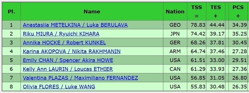 格鲁吉亚搭档米特金娜/贝鲁拉瓦表现较之中国杯更上层楼:后内结环三周、捻转三周、抛内点三周滴水不漏;后半段螺旋线、双人转、托举和步伐全部四级,且所有动作执行分都超过1分!技术44.44/节目内容34.39,合计78.83名列榜首。